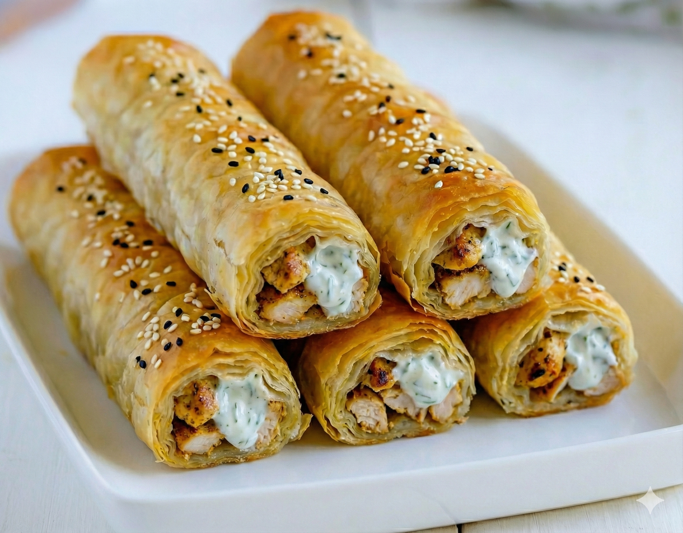 Roulé à la pâte filo fourré à la viande kebab de poulet et sauce tzatzíki.