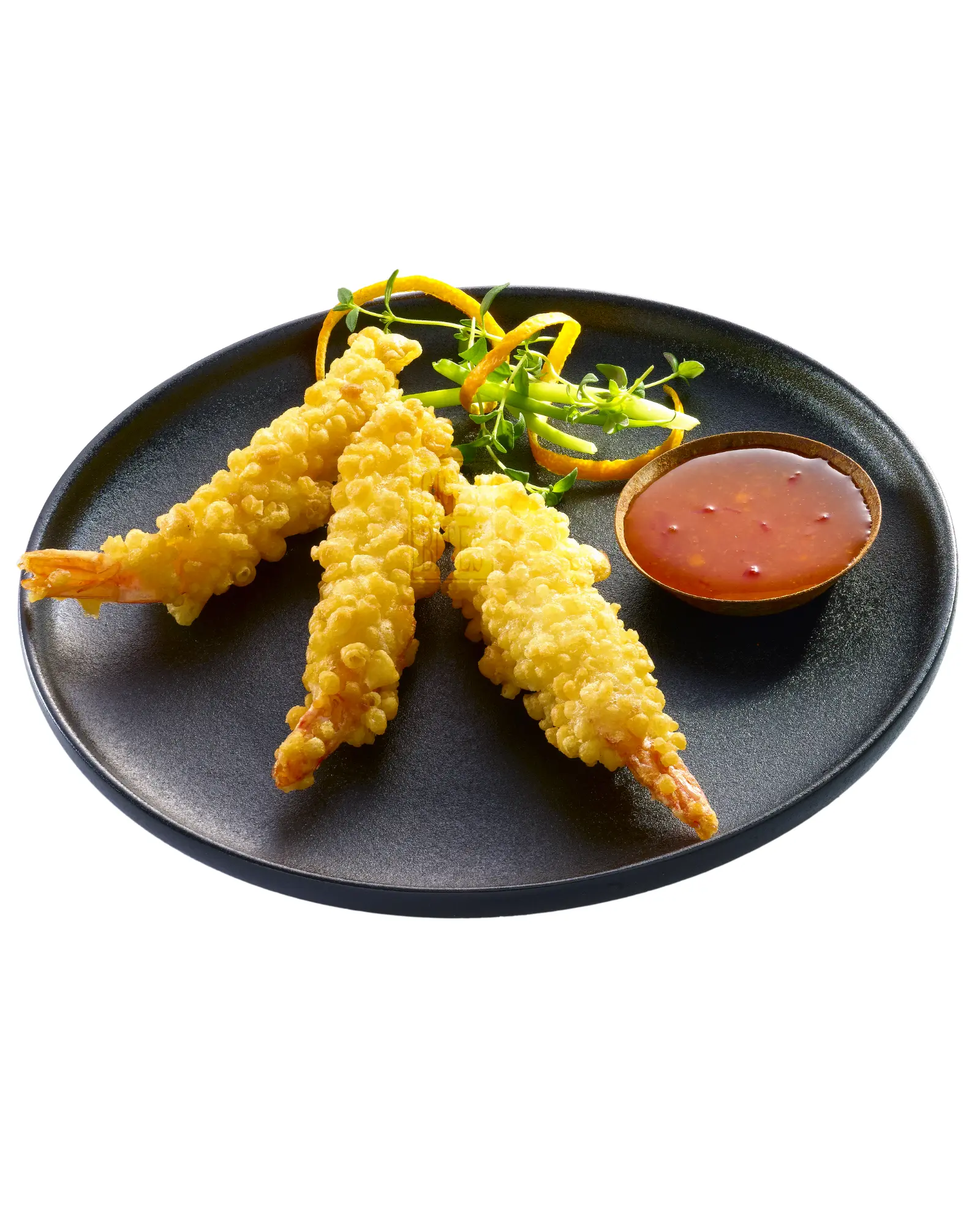 CREVETTE 37 % [CREVETTE (CRUSTACÉ), eau, stabilisant (bicarbonate de sodium), sel], pâte [eau, amidon de maïs modifié, sel, épaississant (gomme de xanthane)], enrobage tempura {eau, pâte à frire [farine de BLÉ (GLUTEN), amidon de maïs, farine de maïs, agents levants (bicarbonate de sodium, diphosphate disodique, carbonate de calcium, phosphate monocalcique), sel, épices (ail, oignon), dextrose], farine de BLÉ (GLUTEN), farine de riz, levure chimique (amidon de tapioca, bicarbonate de sodium), diphosphate disodique, phosphate monocalcique), chapelure (amidon de tapioca, sel), l'huile de SOJA. Sauce au piment doux : sucre, sirop de maltose, eau, ail, amidon de maïs modifié, piment rouge, sel, régulateurs d'acidité (acide acétique, acide citrique), colorant (extrait de paprika).