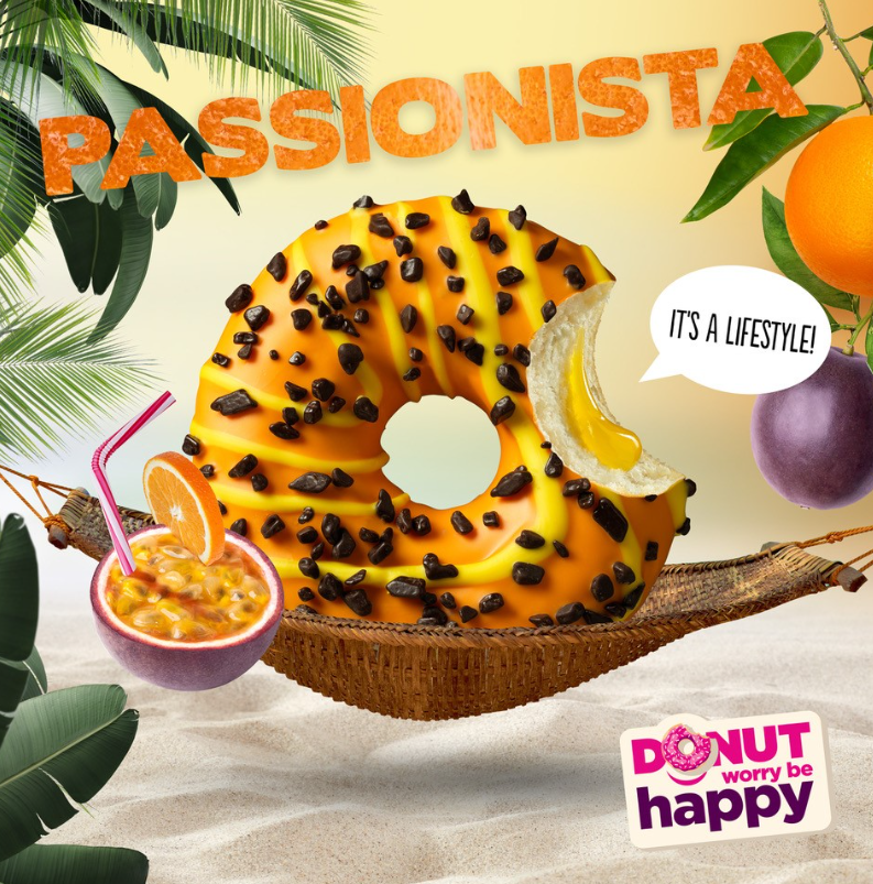 Le nouveau donut fashionista est arrivé ! Avec son glaçage orange strié de jaune et son cœur coulant aux fruits de la passion, comment allez-vous vous y prendre pour dompter ce tigre ?