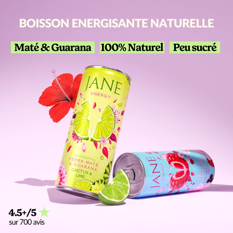 Eau gazéifiée, sucre, jus de citron concentré, extrait de guarana (0,23%), extrait de gingembre, extrait de maté (0,16%), arôme naturel de fruits rouges, denrée alimentaire colorante (concentré de carotte et myrtille), vitamine C.