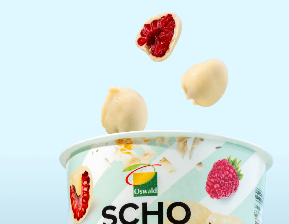 Framboises glacées enrobées de chocolat blanc