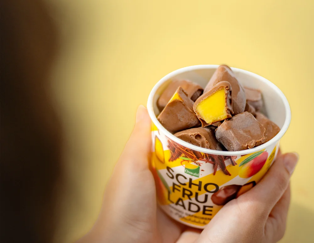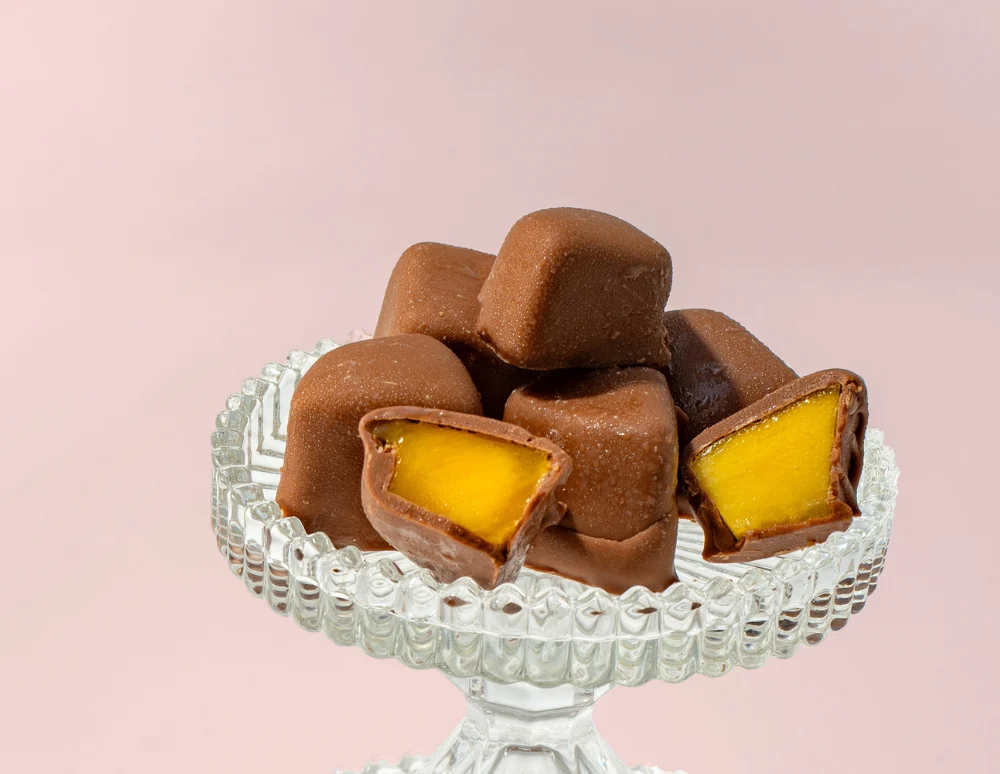 Mangues 63%, chocolat au lait 37% (sucre, beurre de cacao, LAIT écrémé en poudre, pâte de cacao, BEURRE concentré, émulsifiant : lécithine de SOJA, extrait de vanille/teneur en cacao minimum de 35%)