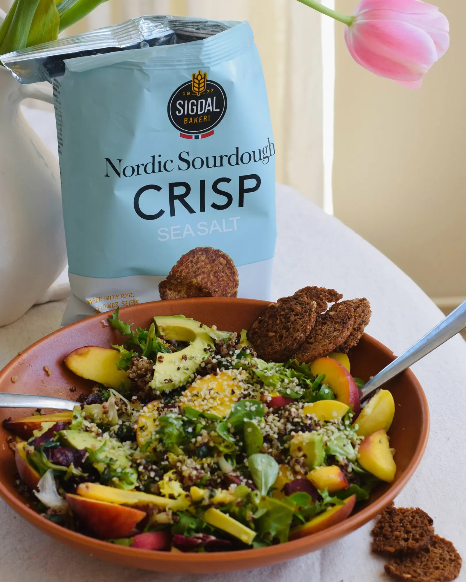 Des toasts nordiques croustillants au seigle et au levain, aromatisés au sel de mer, à la texture fine et légère, qui subliment aussi bien un saumon fumé qu’un fromage de caractère lors d’un apéritif gourmand. Ils peuvent aussi se transformer en croûtons pour enrichir vos salades, ou savourés nature pour apprécier toute leur authenticité.